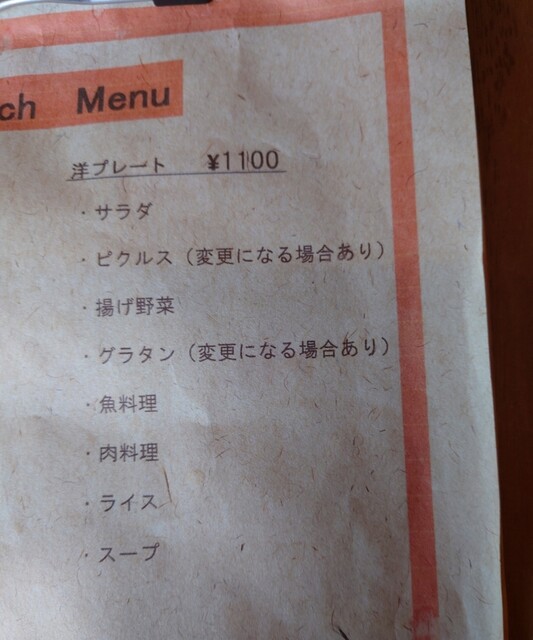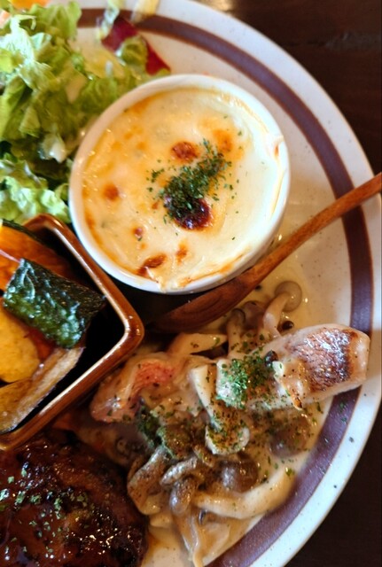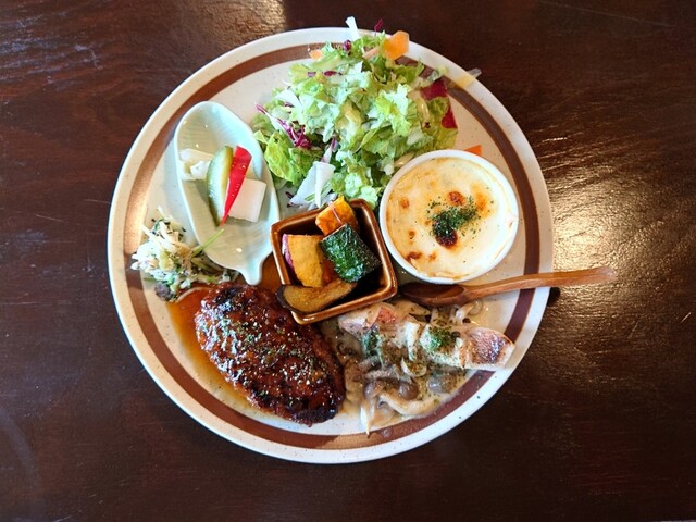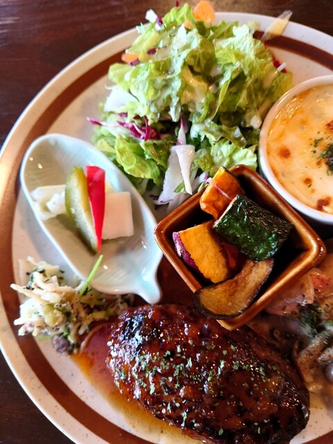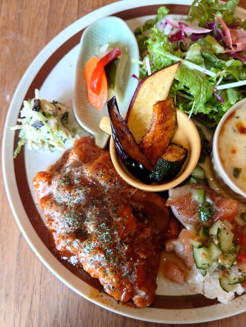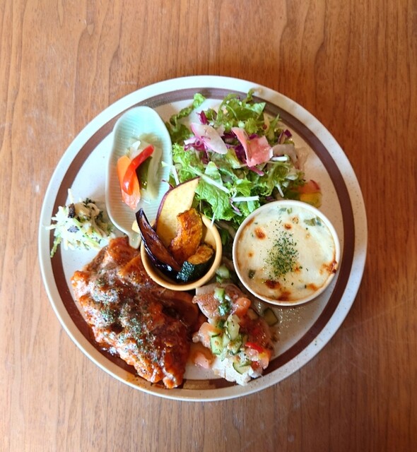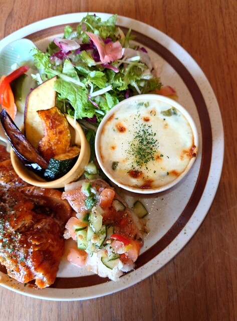 2021年8月に、友人とランチに来た時に、洋プレートを友人が注文しました。その時の写真を見ると、サラダ・グラタン・ピクルス・素揚げは、今日のプレートの内容と同じでした。違うのは、メインの肉と魚と、その隣に添えられている和え物のようなかんじのお料理でした。また、お料理の内容が、きり変わった頃に、来たいです。
