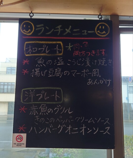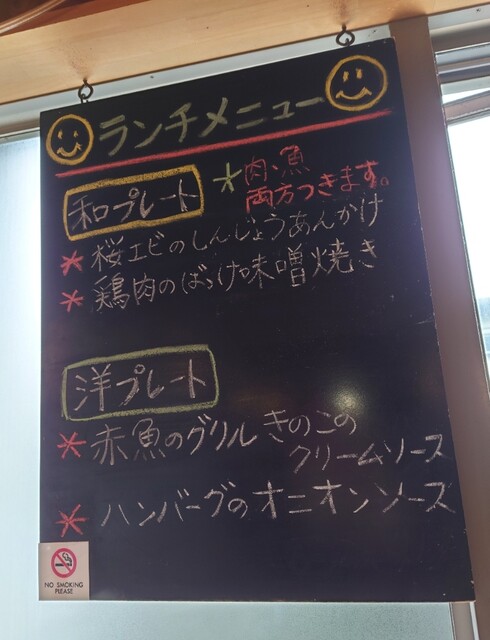 今日のランチの「洋プレート」が食べたくなり、またまた、来ました。和プレートと、洋プレートのメニューは、2022年2月1日に来た時と、同じです。黒板に書かれた洋プレートのメニューには「赤魚のラビゴットソース」「チキンのデミグラスソース煮込み」とあります。