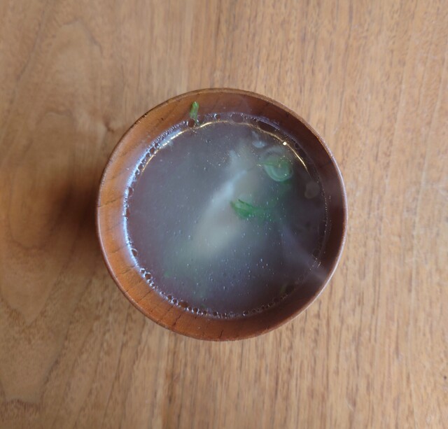 お刺し身は「貝割れ大根の上に、のせられたサーモン」です。小鉢は「いかと、わかめのぬた」です。もう一つの小鉢は「姫竹の子・糸こんにゃくの煮物」です。どちらも、味つけは、ほどよいです。特に、姫竹の子の煮物の味つけは、繊細で、とても、好みでした。汁物は「白身魚のあら汁」で、塩味が、ちょうどいいです。漬け物は「大根と大根の茎」でした。こちらも、おいしいです。実は、私は高知県の郷土料理である「ぬた」は、あまり、好きではないのですが、わりと、おいしく、いただけました。御飯は、おかわりを、お願いしました。