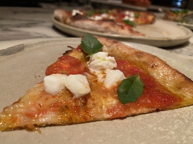 オーガニック小麦を使った生地に、新鮮な水牛のモッツァレラチーズとトマト、バジルをトッピングした、シンプルかつ伝統的なピッツァ