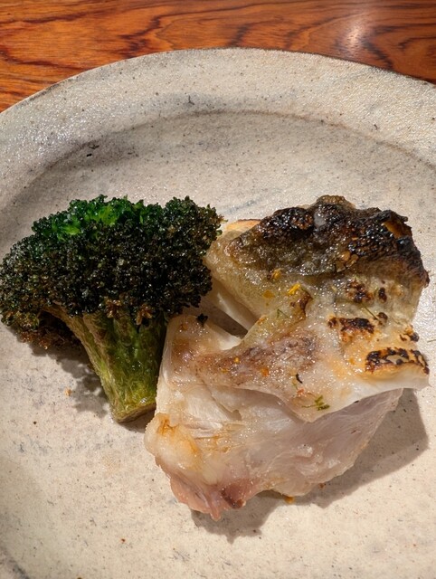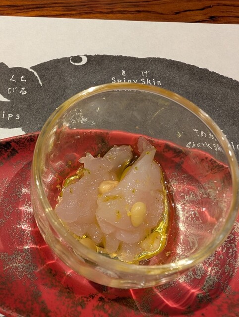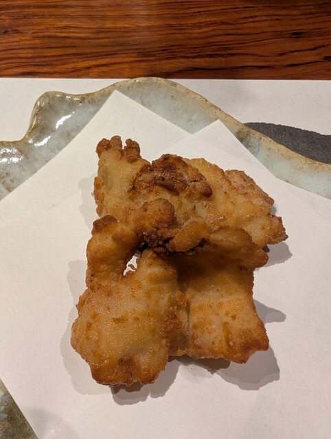 ●焼きふぐ 順番に味の違う部位を一切れづつ焼いて頂けます。ふぐと思えないあっさりしたホルモンのよう。特に皮と身の間が適度な脂があり旨いスパイスが効いていて洋のふぐ