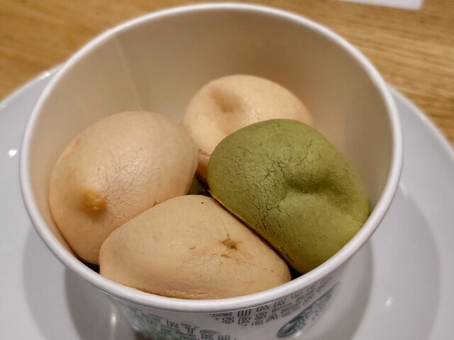 こちらは、桜 味と抹茶 味のもっちりした生地のパン(?)の中に