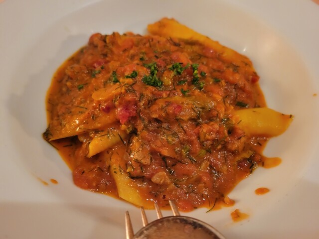 野菜はゆっくり煮込まれてほろほろしていますが、食感を残しつつ柔らかく煮込まれている印象。味付けは濃すぎず、自然の味わいとお肉の旨味が楽しめます。個人的な好みにあった、濃すぎない味わいです。