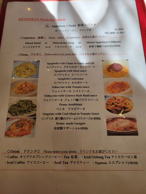 何を食べても、何度食べても美味しいイタリアンのアントニオ。幅広いメニューをたっぷり味わえるディナーとは違いますが、お得なメニューを気軽に楽しめる平日ランチもまたお薦めです。今回は2人で訪問しました。