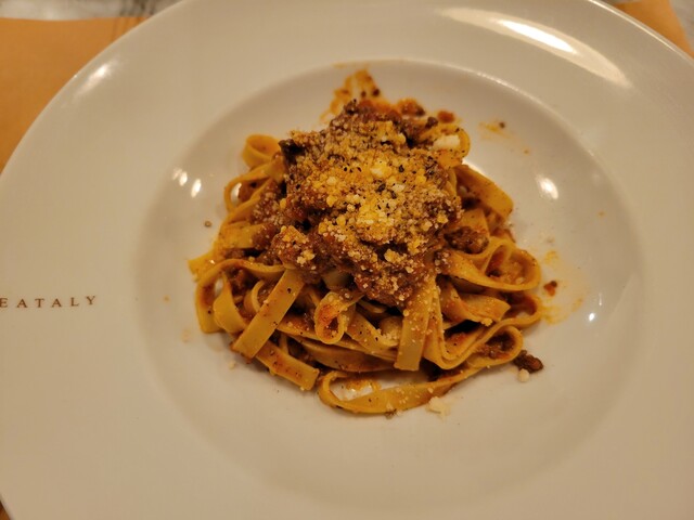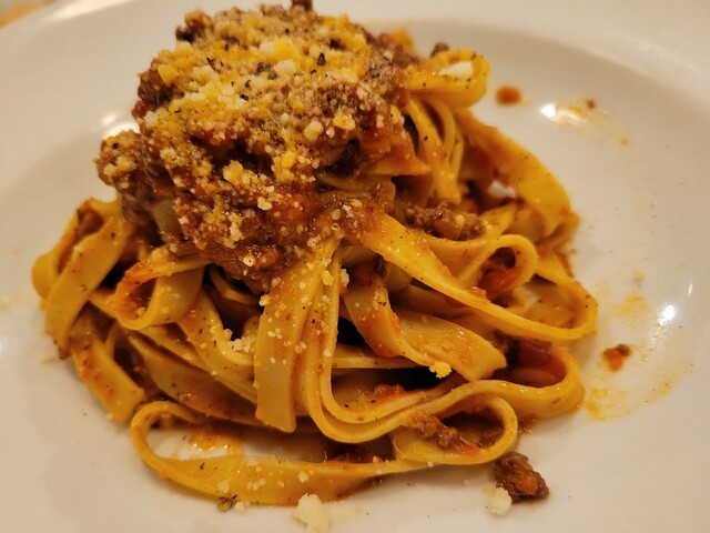 こちらは生パスタの平打ち麺で、生パスタならではのもちもち食感が楽しめます。ソースと肉の味付けも存在感があり、とても美味しかったです。