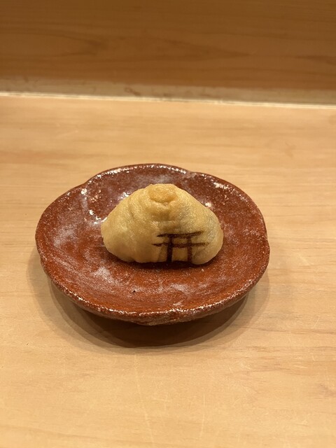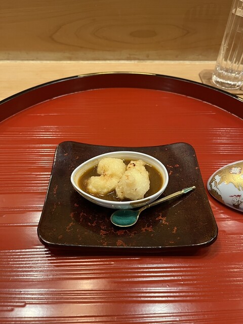先付の河豚の白子は、白子の表面が香ばしく、魚介類の焼けた嫌な匂いが全くない。匂いで言えば焼いた餅に近く、その上品な香ばしさのあとトロトロの白子がいただけます。