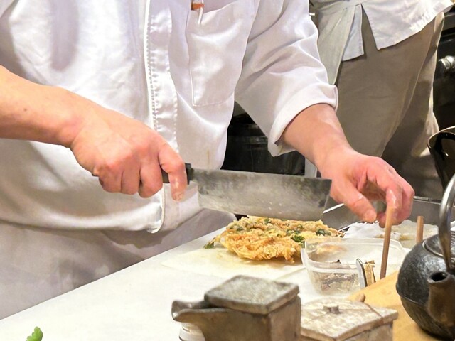 さて、こちらのお店の特徴の一つは、お蕎麦屋さんには珍しく手前がオープンキッチンになっていて、お料理の様子わかり、丁寧な仕事振りに美味しさ、有り難みが増します。蕎麦打ち場も通りに面していて心意気を感じます。