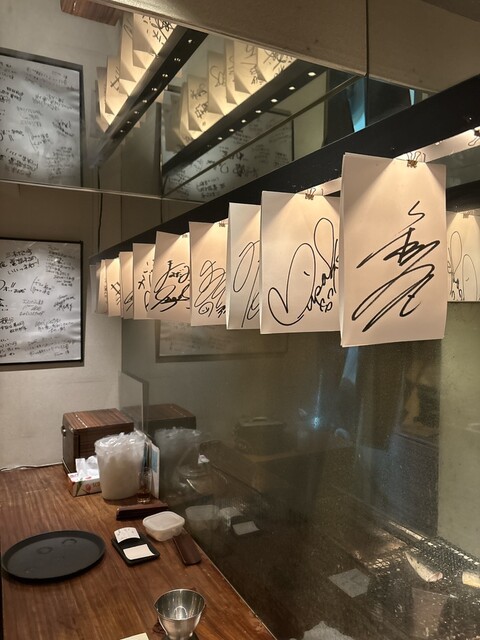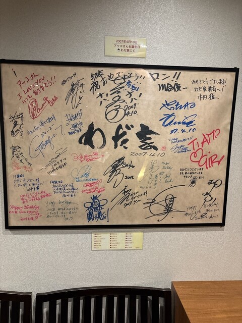 入り口は和田アキ子さんの手形に手をかざす自動ドア。店内は和モダンな空間で落ち着いた雰囲気。有名人のサインがズラリと並んでる。座席はカウンターにテーブル席、個室もあるから宴会、会食にデートにぴったり。