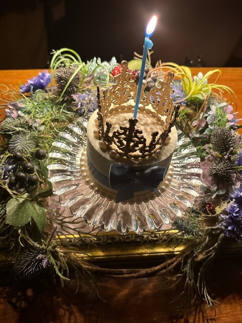 ティアラケーキ。かわいいリボンに花火付きでサプライズ。クリームはあっさり目でボリュームもある。