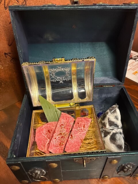 最後に登場する、本日の一押しお肉BOX。宝石箱が登場し中を開けるとプレミアムなお肉が今日はウワミスジ。宝の中にプチギフトまで入っていて、サプライズの連続で楽しい。