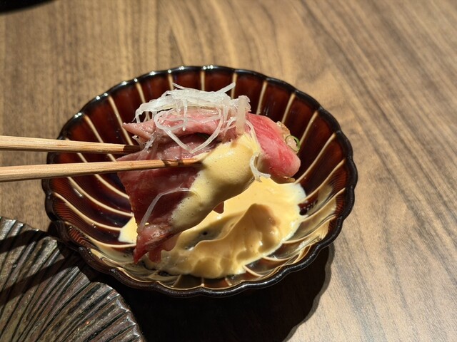 お店の名物でもあるサーロインのすき焼きしゃぶを卵のエスプーマといただく豪華な一品は、エスプーマにすることでなめらかな口溶けと柔らかい食感の間違いないお料理。とろけるようなお肉と合わせて納得の名物でした。