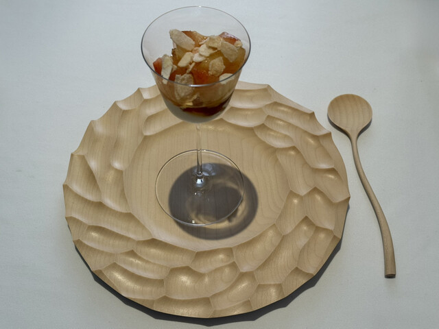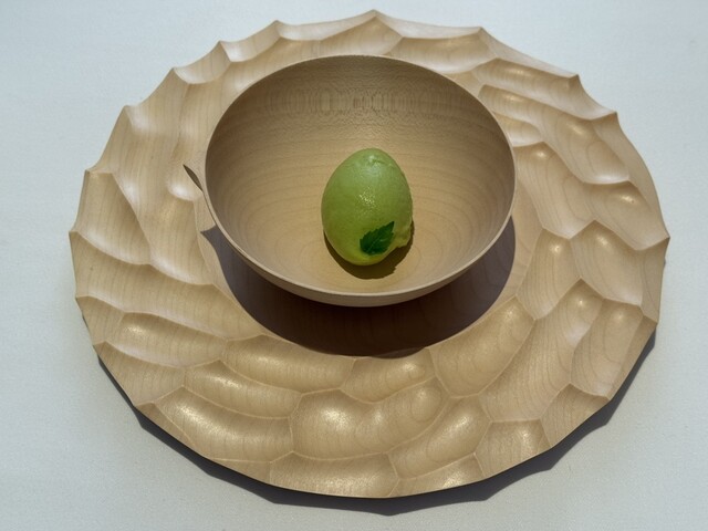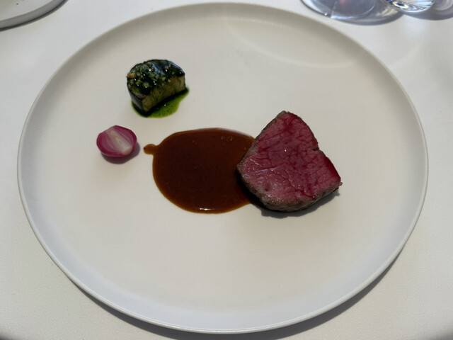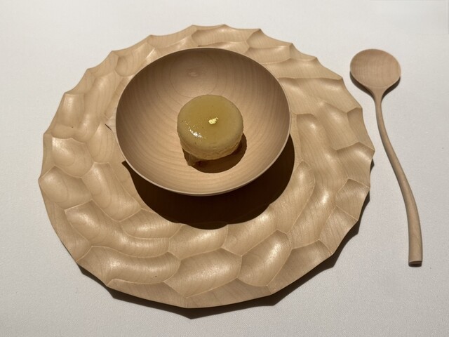 構成もまた独特で、アミューズから始まり、魚や貝類に流れ、野菜のパート、伝統的なフランス料理へのオマージュ、肉のコンソメを挟んでメインディッシュへ、そしてデセールへと展開する、明確な論理を持った組み立てが、このコース全体の骨格を形作っている。