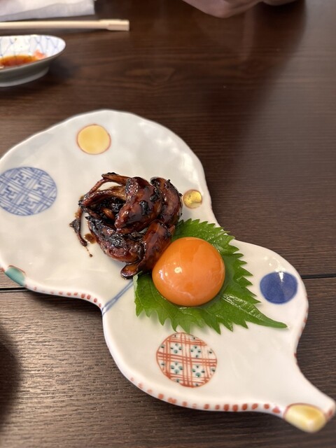 焼きと、茹で(...?肝頼んだらよくあるやつ)。焼いてる方はてりやきみたいな味。黄身をつけて食べます。子供向けな感じ。一方シンプルな方はわさび醤油でいただきます。臭みが全くない...肝本来の味が味わえるのはこっちでした。