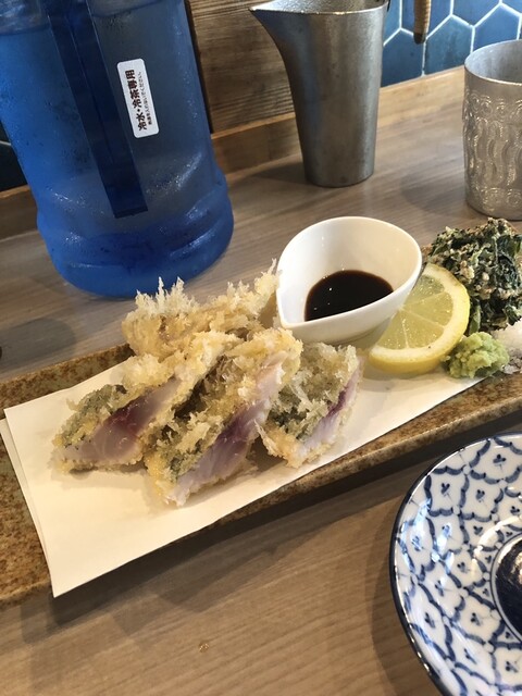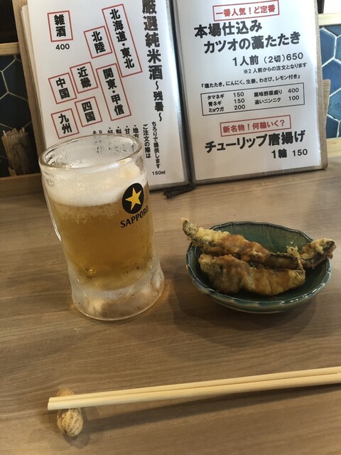座ると飲み物注文して突き出しが出るシステムで今日の突き出しは秋刀魚の天ぷらでした。
