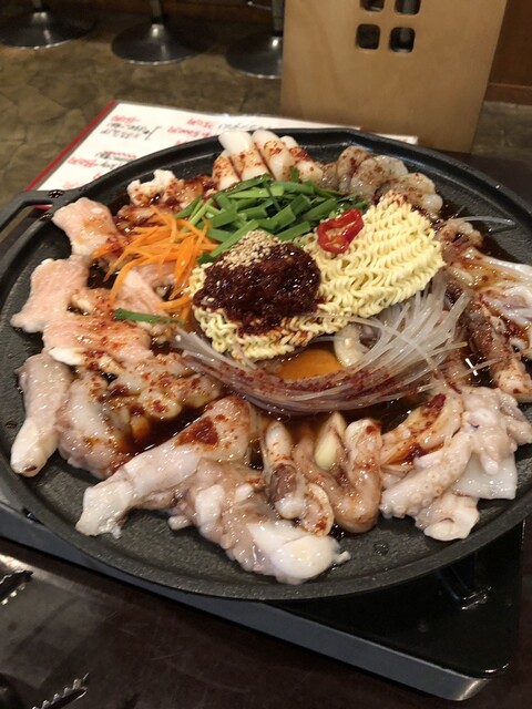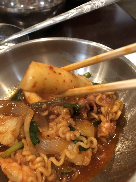 ラーメンの麺が最初から入っています。そしてこちらのお店ではイイダコではなく本物のタコでした!!ラッキーです!タコとホルモン、エビのラインナップでチャプチェの麺とトッポギも入っていてピリ辛とありましたが思ったより甘口、濃厚でお酒にとっても合います。