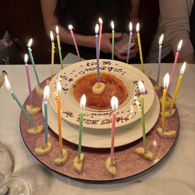 最後はデザートにクレームブリュレを注文。ここでお願いしあったサプライズ。お皿にはバナナを台座としたローソクとパイピングが華やか。