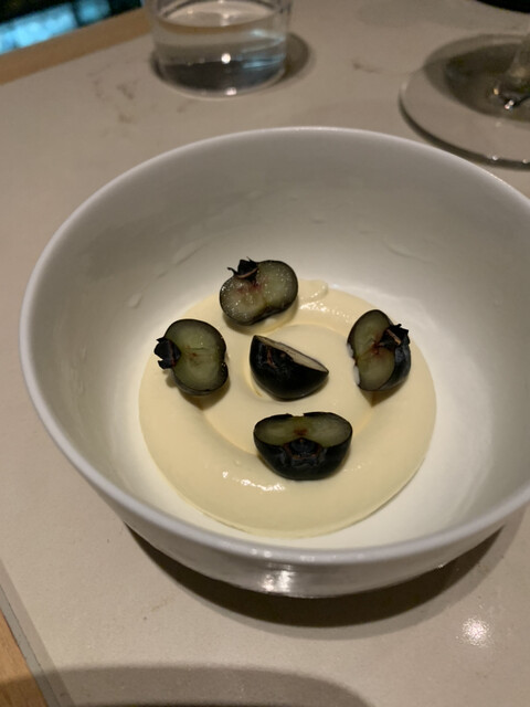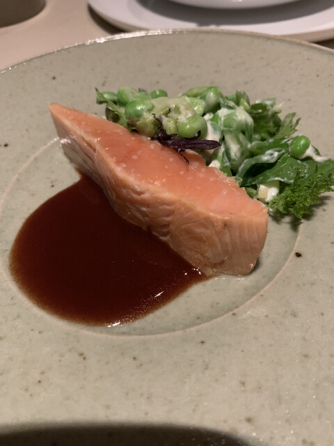 白アスパラガスも、今シーズン何度か食べてますが、この出し方は初めて見ました。薄くスライスされて、生の部分と、軽く火の通った部分が折り重なってます。アオリイカのヌメーっとした食感と、白アスパラガスのシャキッとしたところ対比がなんとも面白い!出汁にバルサミコを加えたソースもグーです。