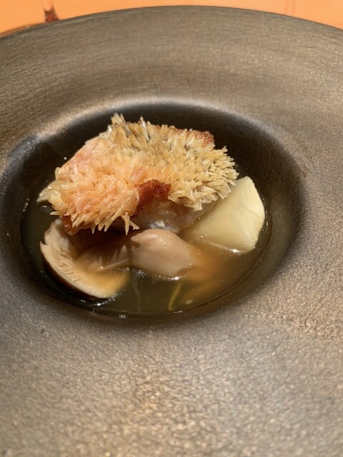 鱗の立った甘鯛、カリカリ、サクサク、中身はしっとり。蕪と椎茸とともに柚子生姜風味の優しいスープに浮かんでいます。