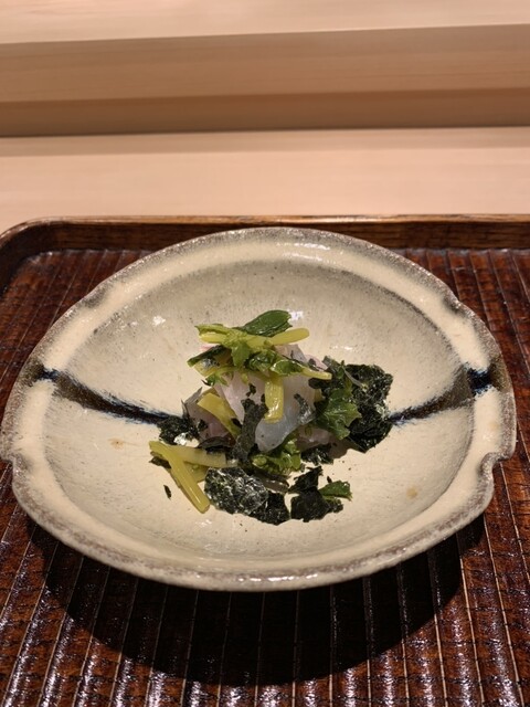 ◯向付は、甘鯛と山葵の茎、海苔の和えもの