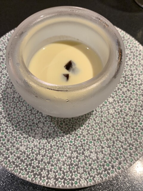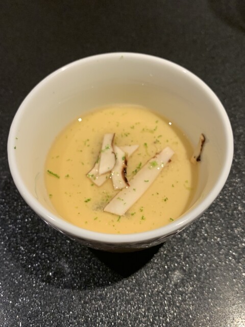 京都の民家を活用したレストランでカウンター8席のみ。お皿はイタリアベネチアのブラーノ島で造られるエルコーレモレッテイの作品とのこと。とても美しい。最初の一皿はパプリカのムース、コンソメジュレ添え。パプリカの味をしっかり感じる一皿。次がこの店のスペシャリティ、野菜のテリーヌ。それぞれを個別に調理した上でキャベツで巻いている為か、野菜一つ一つの味を楽しめる料理。美味しい。次は鰻と松茸の茶碗蒸し。酢橘がかかっていて香りを楽しむことが出来た。とうもろこしのスープにはコーヒーゼリーがある入っていて、ゴールドラッシュの甘味を際立たせている。お魚メインは鰆と翡翠ナスと万願寺とうがらしにアンチョビとヘーゼルナッツのソースがかかっている。これも美味。お肉のメインはもち豚と黒大豆ベーコンのソテーにとうもろこしのパンケーキ添え。デザートはマンゴープリンでした。どの一皿も野菜の素材ノ味をしっかり生かした調理法で美味しくいただきました。大満足。ご馳走様でした。