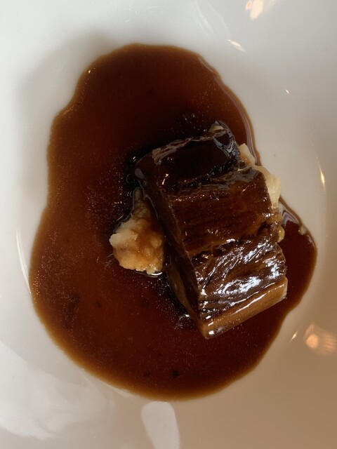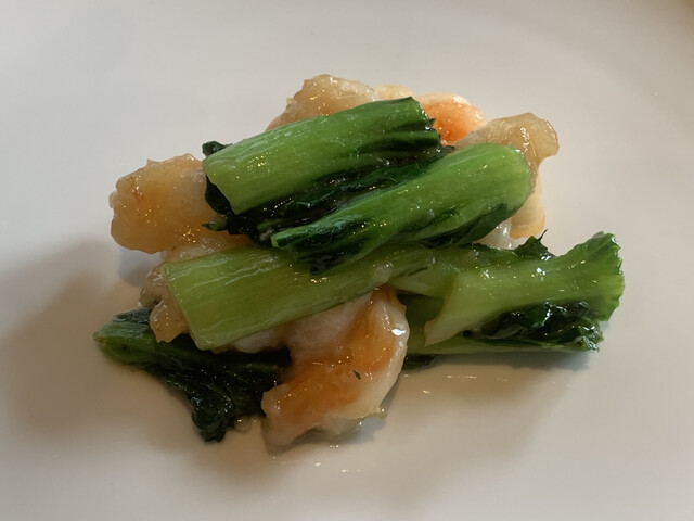 今日は、ウチダテイでランチBコース4,950円を頂くことに。お店はカウンターが3席。4人掛けのテーブルが3卓。奥には個室もある。こじんまりとしているが、本日は満席。前菜は鶏の白レバームースと芋金時。塩味と甘味がマッチして美味しい。二皿目は鱸のお刺身にマスタードソースがかかっている。ねっとりした口当たりをマスタードソースが爽やかに纏めてくれる。鱸も少し熟成されているのか旨味が一杯。続いてフカヒレのスープ。量は少な目だが、フカヒレも食べ応えを感じる大きさで豊かな味わい。海老と小松菜の炒め物は、プリッとした海老の口当たりが最高で美味い。次は鱈の白子の麻辣炒め。白子の旨みに辛味がインパクトを加えている。レンコンのシャキッとした食感もいい。次はアイナメの蒸し物。旨みたっぷりのスープ。美味しい。最後はトンポーロー。黒酢の香りがして食欲をそそる。甘味は抑えめながら、マッシュポテトと一緒に食べると口の中に肉の旨さが広がる。初めての来店だったが、どの料理も期待を大きく超える満足度。ご馳走様でした。また直ぐに来ます。
