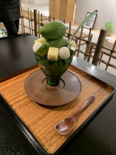 京都高島屋3階にある無碍山房サロンドムゲでわらび餅1,760円と抹茶パフェ2,260円を頂きました。注文してから10分。出来立ての温かいわらび餅が到着。きなこにわらび餅をのせて黒蜜をかけて頬張ると口の中一杯に至福の美味さが広がります。上品この上ないわらび餅。今まで食べたわらび餅の中で最高の美味しさ。菊乃井さんが経営しているだけのことはあります。抹茶パフェも程よい甘味で口当たりがすっきりしていて美味しかったです。