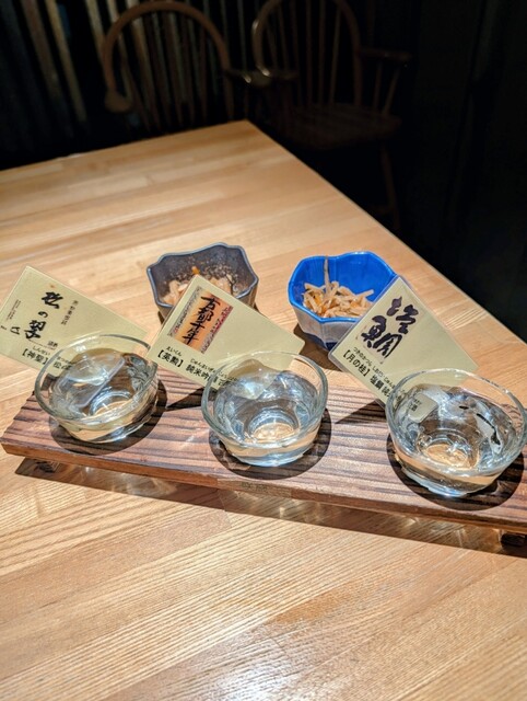 伏見の地酒などから3種類を選んで飲み比べ。鉄板串焼きとの相性も良く、料理に合わせて選べるのが嬉しいポイントです。