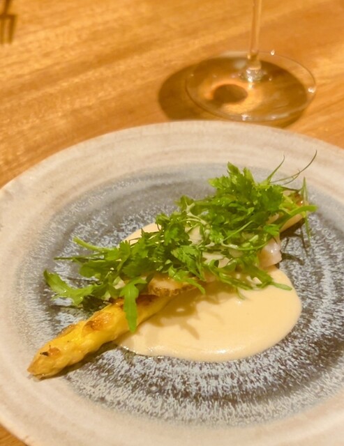市場には出回らない岐阜ホワイトアスパラガスのソテーに珍しい西貝(サザエに似た貝)を組み合わせ