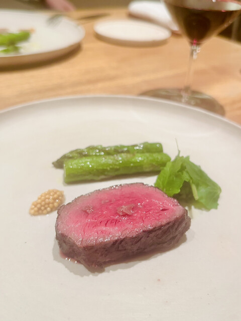 身がぷりっとした光り物にスペインらしい赤ピーマンソースとのコントラストに、甘口のワインが調和する。