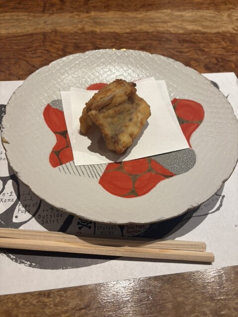 接待でお邪魔させて頂きました。ふぐを贅沢にフルで、しかも焼きのある店はそうそう出会えることはありません。お酒はひれ酒 テッサに始まり、蒸し焼き、焼き、揚げ、テッチリ、カラスミ寿司、特に様々な部位を一つ一つ丁寧に焼いて提供して頂ける焼きは最高でした。またお邪魔したいところですが、自分のお財布で厳しいかも。ご馳走様でした。