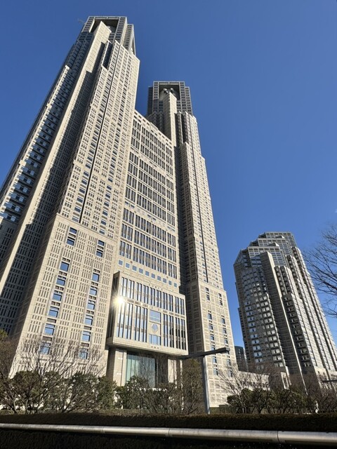 窓からは 公園の緑と 都庁の高層ビル