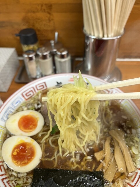 出来上がりまで10分ほど、見事な煮玉子そばが到着!スープから熱々でスープです。まさに町中華の醤油スープ、うまい〜!!スープだけ何度もレンゲでいただき、麺をリフトアップそこで写メを一枚!