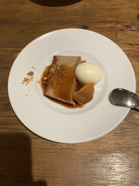 くりプリンとミルクジェラート 柿のコンポート添え ナッツいりクランブルが散らしてある ナイス食感