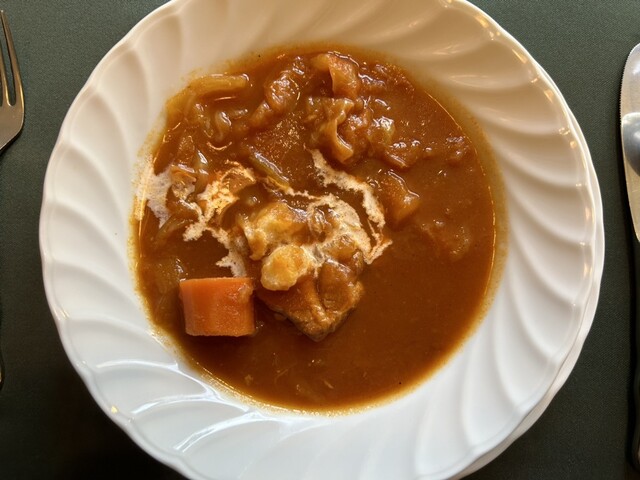 ほどなくビール到着。飲みながら待っているとボルシチ到着。まずスープをひと口。……なんでしょうか。一言で表現すると、滋味深い。あっさりしつつもコクがあり飽きない味わい。お肉もほろほろでご飯に思わずかけたくなる。普段こってりラーメン食べすぎなせいかもしれないがあっさりしつつもこの深い味わいにノックアウト。すごく美味しい。