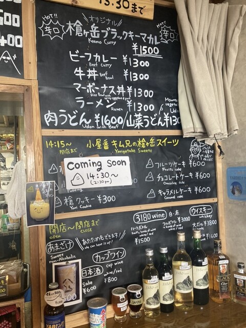 しばし待ち、カレーを注文。山の形に盛られたごはん(槍ヶ岳をイメージ?)は結構固め。カレーはきちんとレトルト(普通に見てた)。でも細かいことは良いのだ。この絶景を見られながら食せることに意味がある(と言い聞かす)。とはいえ最近のレトルトも美味しい。や、普通に美味しい。これで1300円也は山価格とはいえ満足度は高し。無料のお茶も一杯付いてきた。