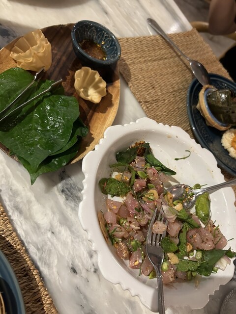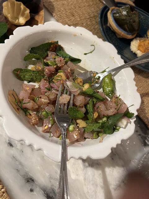 ②生の白身魚をサイコロ状に細かくしたものにレモングラスなどのハーブ、ニンニクチップなどを混ぜて、エゴマのような葉っぱやモナカのようなものにのせていただくもの