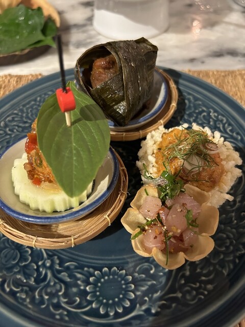 お花にナッツのようなものが乗ったもの、蓮の葉に甘辛いチキンが包まれたもの、きゅうりのようなものにすり身がのったもの、お煎餅のようなものにカレーがのったもの、中央は麺料理。