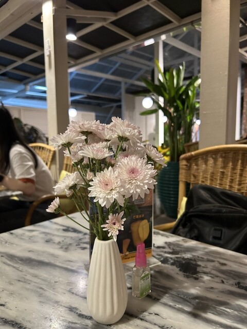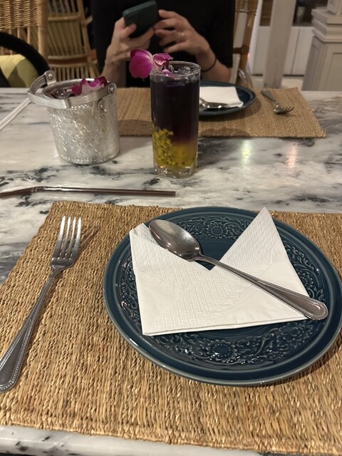 バンコク初日の夜、友人が見つけてくれたミシュランのお店ということでこちらのお店へ2人で来店!予約しておらず不安だったが、受付の方に聞くと外の席ならすぐ入れるということ。離れの建物のバルコニーのような席に通された。雰囲気も素敵。