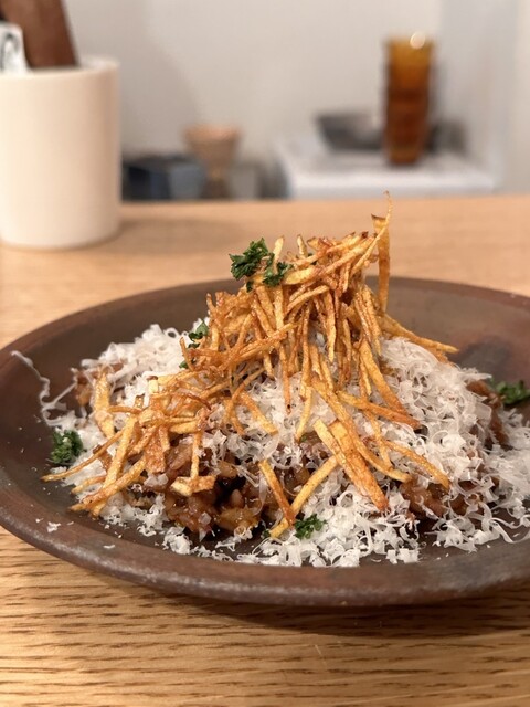 高知のブリにこがし白ネギのペーストと干し柿とクリームチーズ。インドのスナック的なジュリーアルーバジャをたっぷりと。
