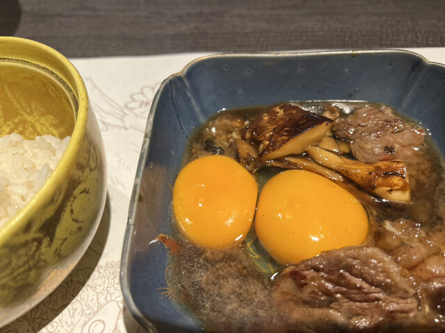 どのお料理も丁寧に説明を受けます、楽しいです、どれも本当に美味しいです。最後のすき焼きは、卵が2つ。卵好きの心を揺さぶります。