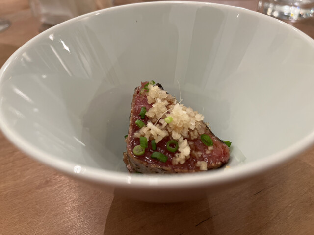 その中で、今回一際感動したのが、太刀魚の串焼き。口に入れるとふわっふわっ。さらにランプ肉。ちょうどいいバランスで入荷しましたと言われたけど、ジューシーさを残しつつエアリーな味わい。お腹いっぱいでも食べられました。