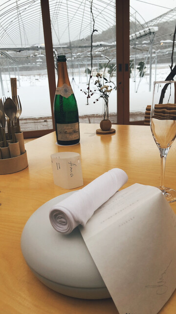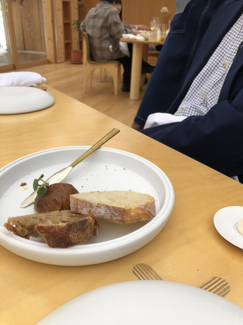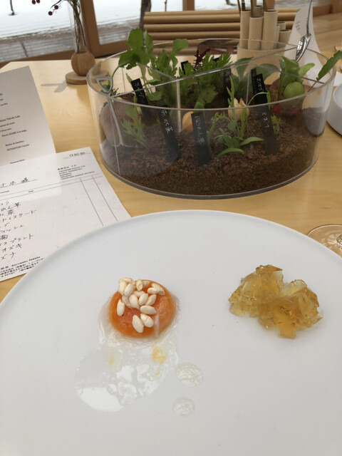 「紙の教会」で有名な建築家 坂茂氏設計のレストラン、通されたホールで、まずはアミューズ、お出迎えの品々を楽しみました。金沢名物のかぶら寿司に手を入れた一品が大変美味しかったです。