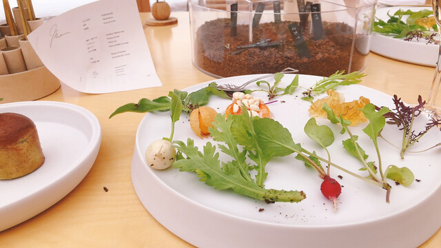 テーブルに着席後はアミューズのあと、自家農園での採れたての摘み菜の数々
