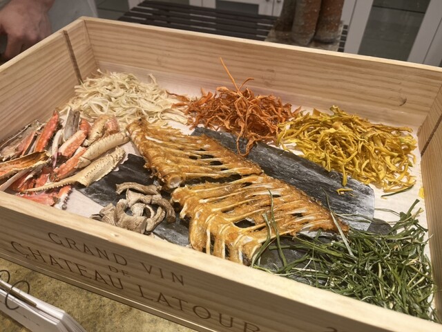 昆布みかんの香りがエビとその下にある野菜や柿を包み込んで余韻が続く一品