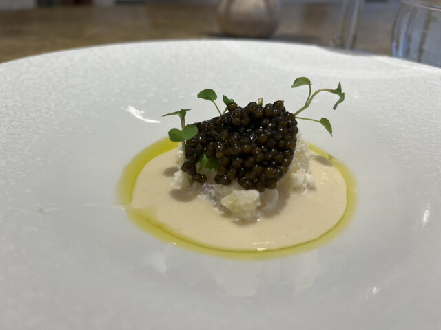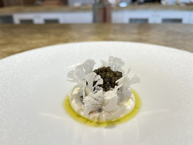 カリフラワーのムースにズワイガニ、キャビアにシチリア産のフレッシュなグリーンオリーブ