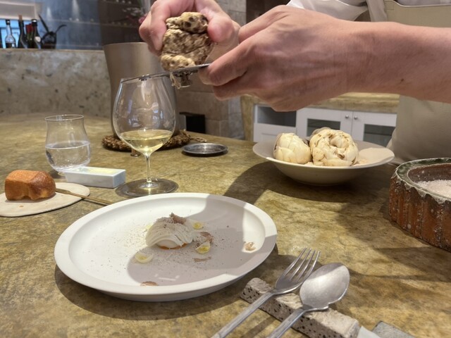 美しいモンブランと化した百合根、シェフがこれにしましょうと運んできたのが白トリュフ、卵との相性もよく、香りを十分に楽しめる逸品