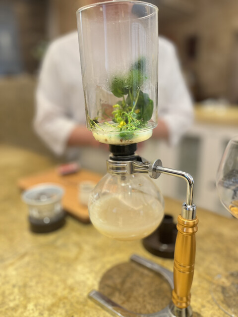 全てが美味しく、特にきのこのサイフォン仕立ては、秋が体に染み渡る感じでした。シェフのフランス時代の修行先、きのこの魔術師と呼ばれるレジスマルコンへのオマージュ。