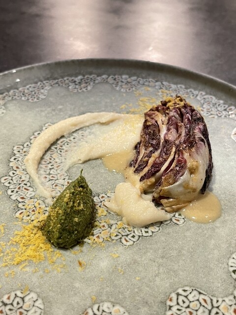 トレビスの苦味を楽しむ温菜は、赤ワインとごまのビネグレット!ザーサイの発酵した葉っぱの部分だけ、香りとPSOをあわせて供されました