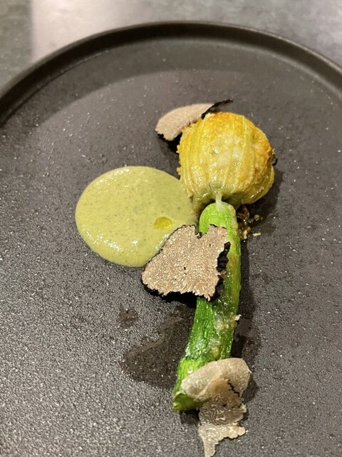 花ズッキーニは、ゴマ、花ズッキーニムース、ハーブでアレンジ!フリットではなくて、この滑らかな調理法は流石です。