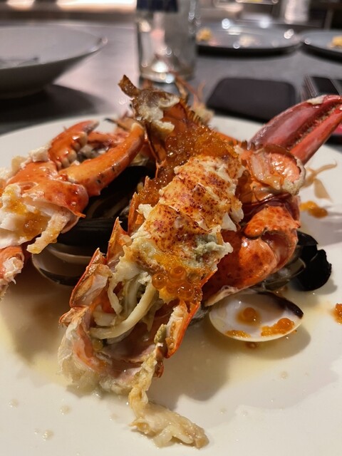オマール海老一尾丸焼きロブスターオーブンローストと、長野ダボス牧場産 短角黒毛和牛フィレステーキを山ワサビと出汁海苔の胡桃ソースで!